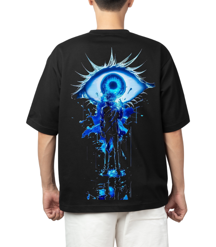 When the blindfold lifts, the world holds its breath. This design captures Satoru Gojo in his most iconic moment — unveiling his glowing blue Six Eyes, a symbol of unmatched vision, power, and confidence.